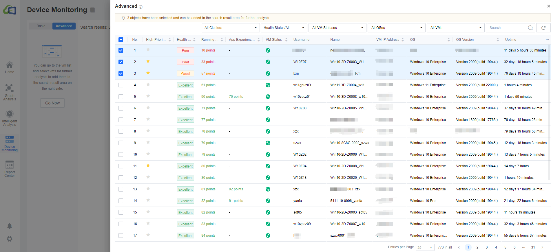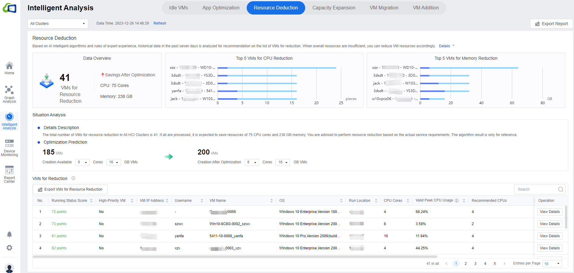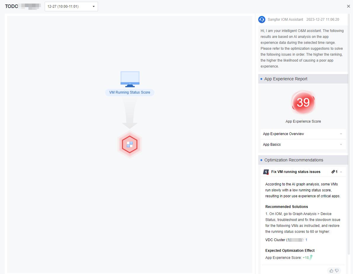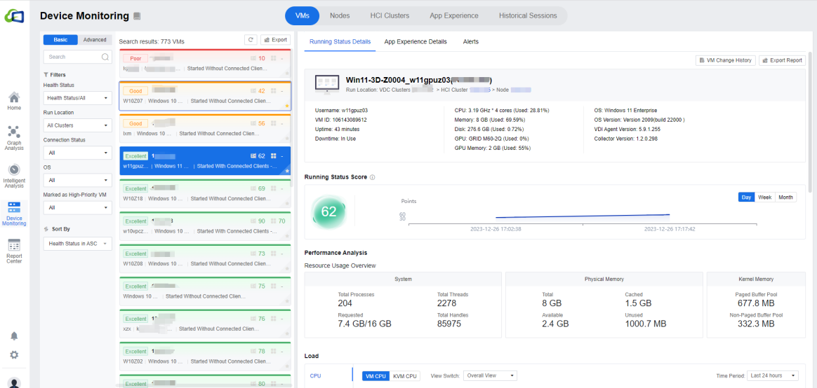 The system combines machine learning algorithms and artificial intelligence technology to encompass operation and maintenance solutions for applications, networks, storage, virtual machines, physical machine clusters, and other systems to achieve rapid troubleshooting of VDI performance problems, including but not limited to virtual machine lagging, physical resource bottlenecks, application anomalies, network interruptions, etc., and intelligently analyzes desktop cloud usage-related problems 7*24 to provide a full range of optimized solution.